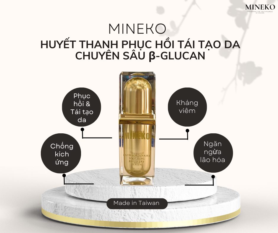 Tinh chất dưỡng da cao cấp của Mineko giúp phục hồi, tái tạo da và chống kích ứng. Sản phẩm cũng có khả năng làm dịu, ngăn chặn tác hại từ tia UV và ngăn ngừa lão hóa. Tinh chất dưỡng da Mineko cung cấp dưỡng chất, trẻ hóa, dưỡng ẩm, lành ngừa viêm giảm đỏ, cải thiện nếp nhăn, bảo vệ da, sáng da, mờ thâm sạm và thu nhỏ lỗ chân lông.