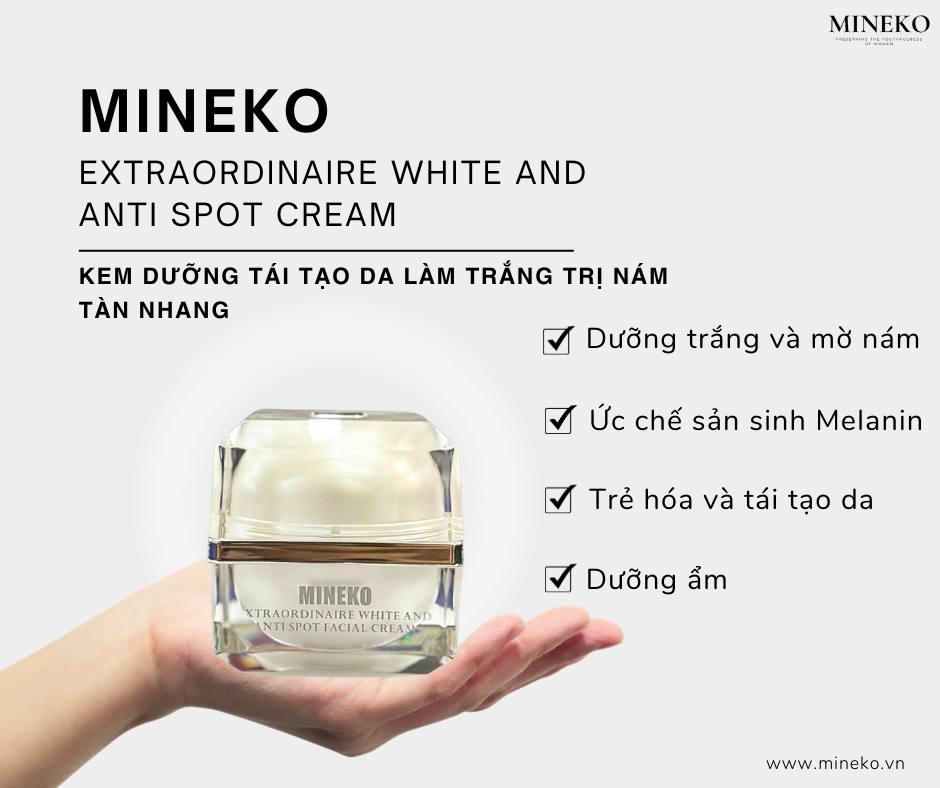 Kem dưỡng trắng da của Mineko chiết xuất từ thiên nhiên, giàu độ ẩm cùng với dưỡng chất cần thiết. Kem dễ dàng thẩm thấu vào da, nhanh chóng làm mềm da và chống lại các tác động từ môi trường. Sản phẩm này không chỉ làm trắng da mà còn ngăn ngừa và phục hồi da lão hóa.